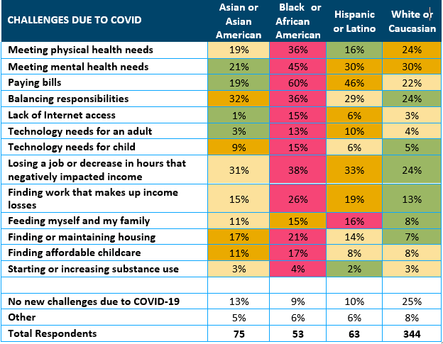 The following chart shows the percentage of respondents reporting each challenge by race/ ethnicity (red is the highest percentage, gold is the second highest, light yellow is the third highest, and green is the lowest):
