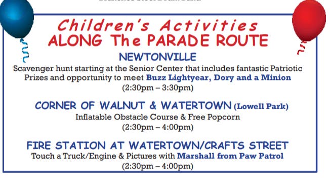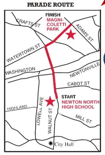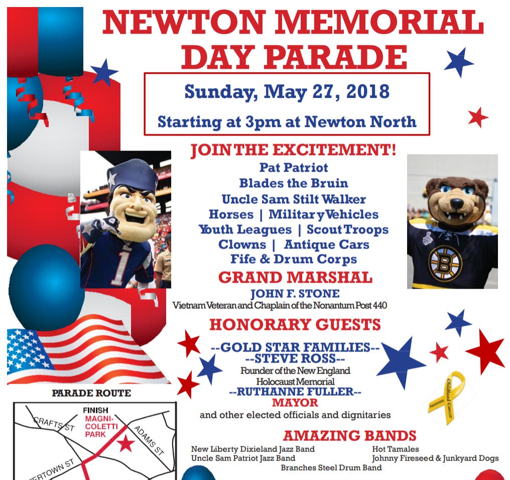 This year's Newton Memorial Day Parade will be held Sunday May 27. The parade begins at 3 p.m. at Newton North High School (457 Walnut St.) and will travel north on Walnut Street, taking a right on Watertown Street and ending at Magni-Coletti Park.