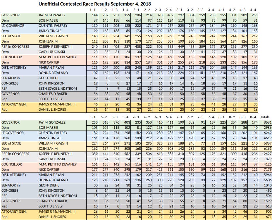 As of 9:30 p.m. Newton appeared to favor Jay Gonzalez to Bob Massie for governor, the race for Secretary of State was closer with only about 300 votes between the two candidates, then when it came to the the local Congressional races: Kennedy blew away challenger Gary Rucinski and Geoff Diehl secured the Republican Primary for senator.