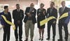 Dr. Michael R. Jaff, President, NWH, (center) cuts the ribbon, alongside (left to right) Ann Berwick, Director of Sustainability, City of Newton; Dennis Villanueva, CEM, CEP, CSDP, Senior Manager of Energy & Sustainability, Partners HealthCare; Ellen Moloney, COO, NWH; Eric Shiemann, General Manager, GE Solar Division; and, Joe Opolski, Executive Director, Support Services, NWH, to mark the completion of the solar energy project.