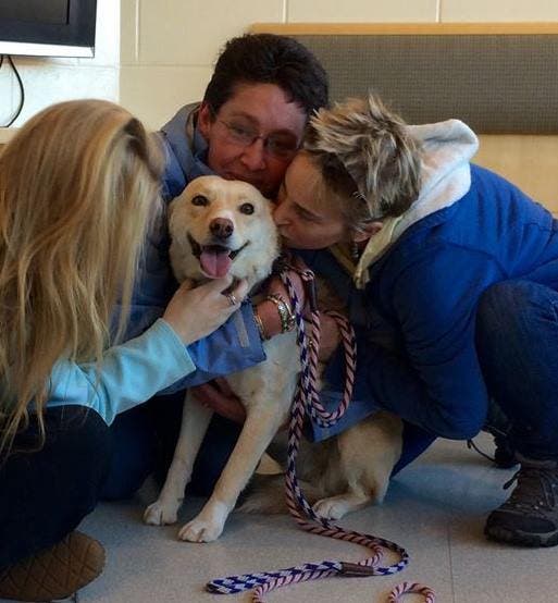 “A call came in at 4:30 this afternoon from a gentleman in Dedham who had just seen Brighton’s info on Dedham Patch. He said he’d seen Brighton at 10:30 last night running across Ames Street into a yard on Fisher Street in Dedham. We all converged on the area and everything happened at once-found tracks, two other people in the neighborhood had seen her within the hour, Brighton’s owners walked down to the end of the street where she had been seen minutes before (Bingham St), and there she was. When Brighton and her family saw each other, Brighton came running right to them. They took her to the MSPCA to be safe, and sweet girl has some very swollen and cut up paws from her travels, but she is in perfect health otherwise. Thank you doesn’t even begin to cut it, but so many thanks yous are forthcoming once the shaking stops!”