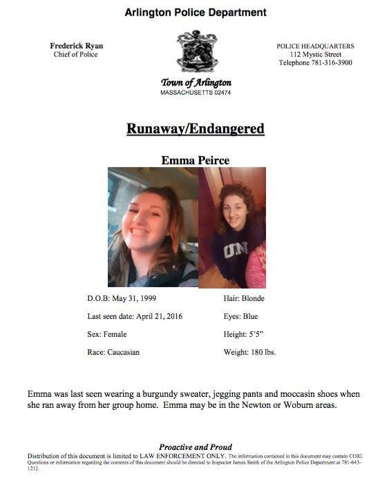 Emma Pierce was last seen wearing a burgundy sweater, jegging pants and moccasin shoes. She is known to frequent the Woburn and Newton areas.