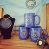 Items include a sweatshirt, t-shirt, coffee mug, lapel pin, ornament, and decorative plate. All items display the 250th logo created by Joanne Miller Studios.