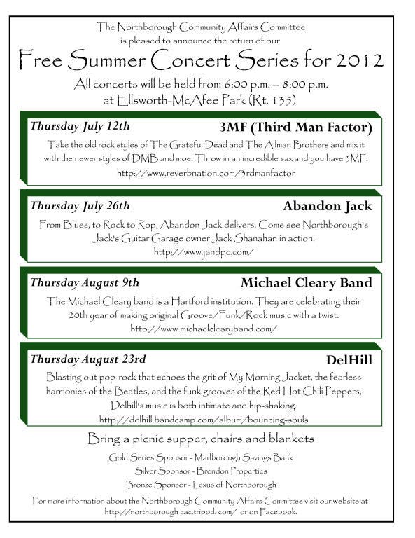 The Northborough Community Affairs Committee is pleased to announce the return of our free Summer Concert Series for 2012.