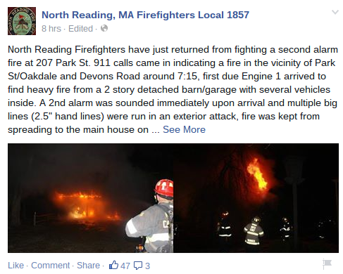 Firefighters responded to a call at about 7:15 p.m. Sunday concerning a fire in the area of Park Street and Oakdale Road and Devons Road. Engine 1 arrived and reported a heavy fire for a two-story detached barn/garage, which contained vehicles, according to North Reading Firefighters Local 1857’s Facebook page.