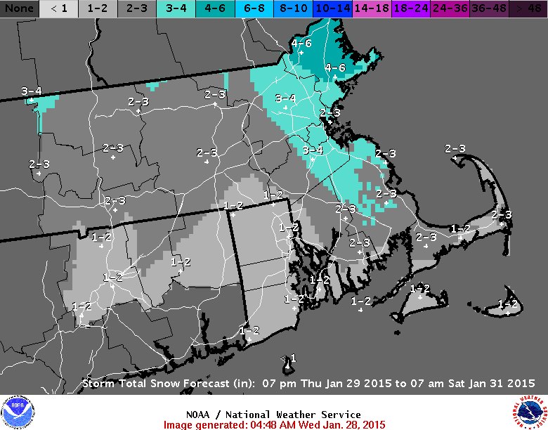 The National Weather Service said parts of Massachusetts could get as much as 6 inches of snow on late Thursday night and Friday.