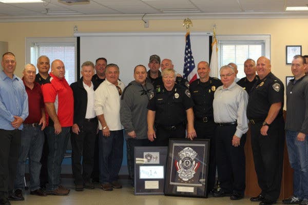 Current and retired members of the North Reading Police Department gathered on Sunday to give Officer Wulleman a proper sendoff. They presented him with several mementos, including a framed North Reading Police badge and patch with a Massachusetts police license plate.