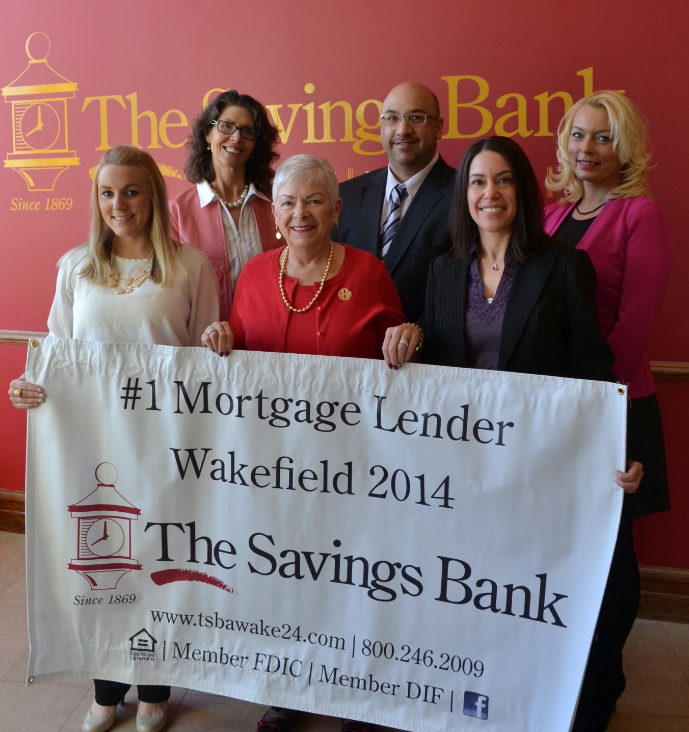 The Savings Bank was recently recognized by the Warren Group as the #1 Lender in Wakefield for 2014. Among the staff members who helped celebrate the honor were (front row, left to right) Amanda Ippolito, Administrative Assistant, Retail Lending; Kathleen Beaulieu, Senior Vice President – Retail Lending; and Tina Savioli-Montross, Loan Processor, Retail Lending. (Back row, left to right) Melody Silveira, Loan Processor, Retail Banking; Jeff D’Alessandro, Assistant Vice President - Senior Mortgage Originator; and Courtney Miano, Underwriting Officer, Retail Lending.