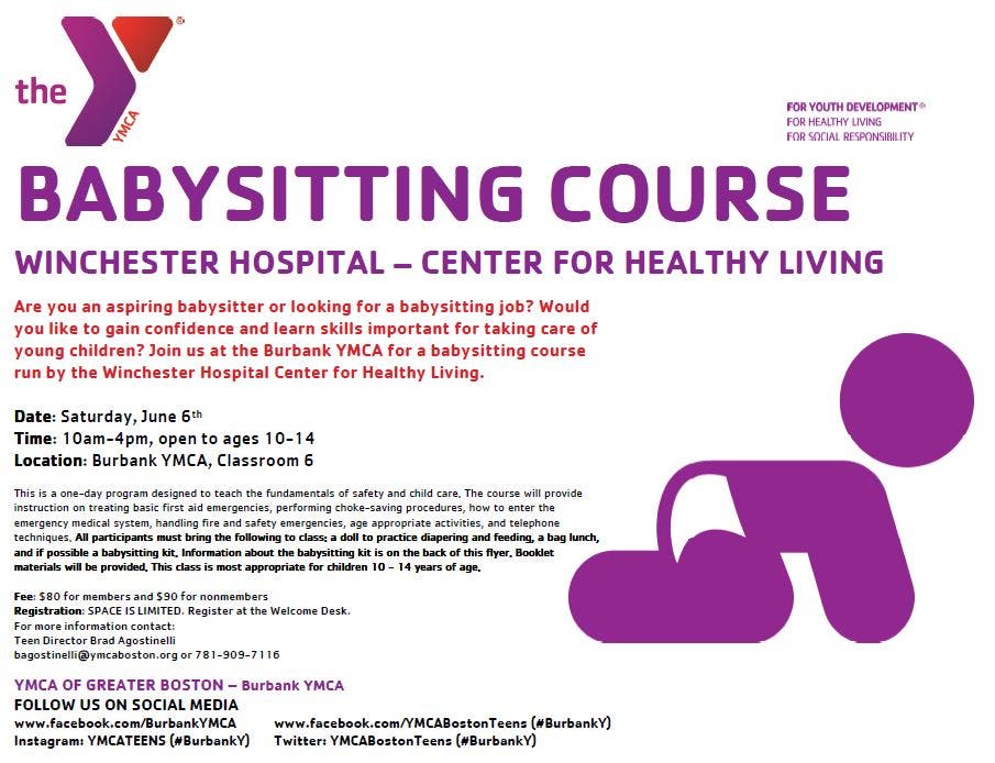 The Burbank YMCA is hosting a babysitting course run by Winchester Hospital - Center for Healthy Living. The course is open to ages 10-14.