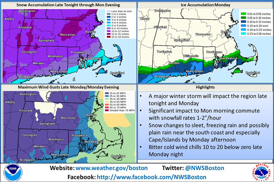 The latest NWS snowfall total shows that Central Massachusetts may get 12-15 inches. Eastern Massachusetts is expected to get 10-12 inches except for the South Shore and Cape Cod and the Islands, which will see lower amounts because of the changeover to sleet and freezing rain on Monday afternoon.