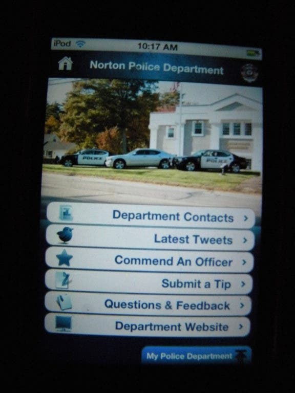 The phone application or “app” can be downloaded free by searching for My Police Department or MyPD in the iPhone or Android marketplace. The app is packed with ways to contact the Norton police and send information to the department.