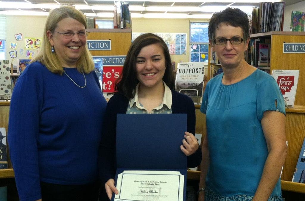 At the Friends of the Peabody Institute Library meeting on Wednesday, June 5th, three college-bound Library Pages were each given $200 scholarships to help them with their college expenses. Elina Mako, Library Page at the Main Library attended the meeting and was presented with her scholarship and certificate by Gerri Guyote, Assistant Library Director and Paula Kilcoyne, President of the Friends. Ms. Mako will be attending the Massachusetts College of Pharmacology. Two additional Pages were unable to attend the meeting, but also received scholarships: Lindsay Broderick, West Branch Library Page, who will be attending the Rochester Institute and Technology and Kelsey Littlefield, South Branch Library Page who will be attending Holy Cross College The Friends wish these Pages the best as they embark on their college endeavors.