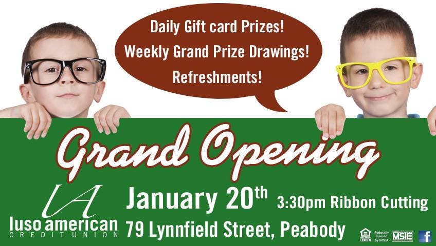 Luso American Credit Union will hold a grand opening at its new branch at 3:30 Tuesday, Jan. 20 at 79 Lynnfield St. (CVS Plaza), Peabody.