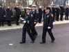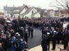 The procession turned up School Street and entered the church from the rear, where it was met with another large crowd of mourners, firefighters and police officers at attention outside the front of the church.