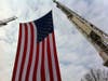 Firefighters held their salute as the procession passed by underneath a giant American flag suspended on either side by a ladder truck -- Peabody's old Ladder 1 and Engine 1 from the Danvers Fire Department.