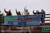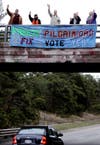 Supporters of the Freeze Pilgrim ballot question held their banners on the Route 3 overpass Thursday night waving at passing cars.