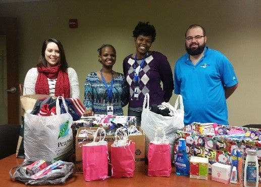 Shown: Avery Moore, Lenilda Carvalho, Mirchelle Ange-Laveus and Frank Faria from OCES' Brockton office gathering personal care items for delivery to MainSpring House.