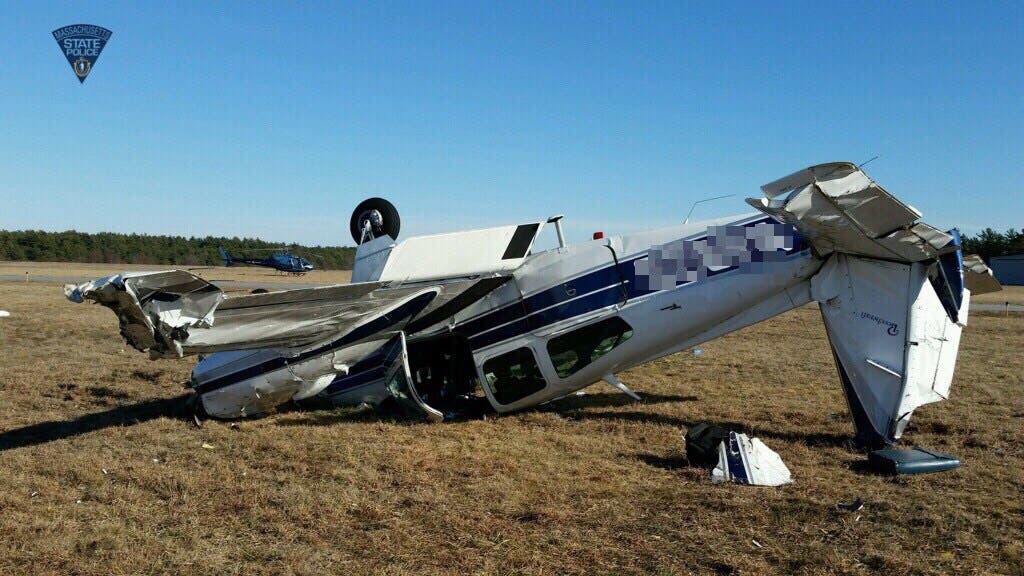 Photo: The aftermath of a plane crash at Plymouth Airport Saturday. (Credit: Mass. State Police)
