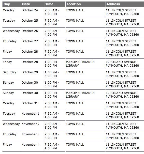 In Plymouth, the town clerk's office is open until 4 p.m. to accommodate registrations.