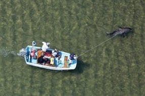 A witness said the shark jumped out of the water to catch a bird but landed on a sand bar and eventually washed up on shore. Rescuers tied a rope to the shark’s tail and pulled it back out to sea.