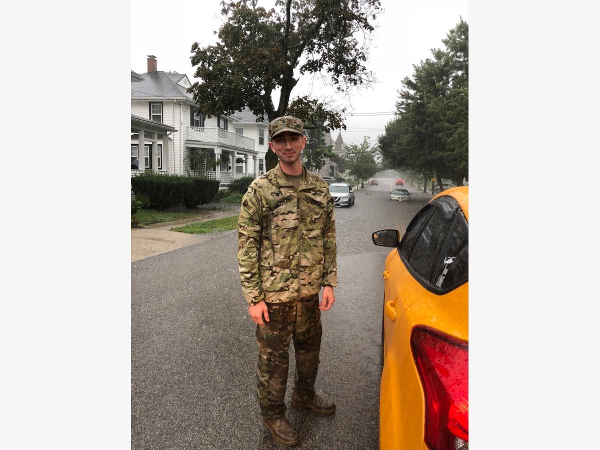 Specialist Mathew Hernon, who is with the 1058 transportation company out of Hingham, saved a woman who drove down a flooded Standish Avenue Tuesday. With water levels near the license plate of the car, the woman had to crawl out of her window to leave her vehicle. Hernon assisted her and carried her out to safety.