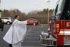 After Mass Fr. Patrick Armano of Reading, the school’s chaplain, blessed the fire trucks and police vehicles in the Austin Prep parking lot.