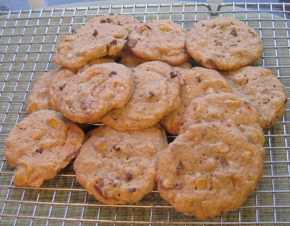 The results were awesome! The cookie was chewy and rich with big chunks of chips and candy bar throughout. It originally called for chocolate chips, but I was out so used butterscotch instead. The combo of butterscotch, chocolate, and the slightly peanutty cookie was awesome, and demanded a glass of milk to wash it all down. The base cookie recipe itself (adapted by Nook & Pantry from a Cook's Illustrated chocolate chip cookie recipe) is better than the Toll House recipe I have used for many years. That was an epiphany for sure!