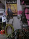 The shop is tucked away behind a vast weed-strewn, swamp-filled lot, concrete buildings and a billboard. It sits across the street from the former Stop and Shop; pink stripes line its walls and a 50's poster of a pin-up girl mechanic draped over a car hood hangs across the room from a poster of Rosie the Riveter.