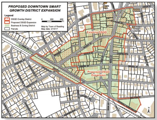 In April 2017 the Board of Selectmen supported an effort by the Community Planning and Development Commission (CPDC) to expand Reading’s “Smart Growth District” boundaries. Under Massachusetts state law (Chapter 40R), properties within a town-established Smart Growth District qualify for mixed-use zoning (commercial with a residential component). Also by law, the entire Smart Growth zone is protected from state-authorized, unregulated high-density development under 40B. The Smart Growth District puts control over town development back in Reading’s hands.