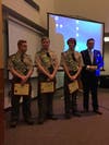 And about those Eagle Scouts who started the night. Adam Clark, Christopher Rogers, and Jared Casalinuovo of Troop 72 were joined by Scout leader John Meyers in being celebrated for their contributions to Reading. Clark built bat boxes in the town forest in an effort to help with the mosquitos. Rogers improved Sanborn Street landscaping, and Casalinuovo helped renovate the Old South Church.
