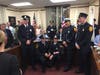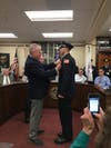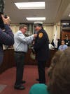 Long before that vote the Selectmen's Meeting Room was the home of a celebration as first Police Chief Mark Segalla, then Fire Chief Greg Burns officiated at a badge-pinning ceremony for their new members. Segalla introduced three new members to fill a roster depleted by four retirements this year. Andrew Kirwan, Zachary Fontes, and Benjamin Woodward all received their badges from family members. Then it was Burns' turn, first recognizing Bryan Ryan on his promotion to lieutenant, then welcoming Jon Dyer as a new firefighter/EMT.