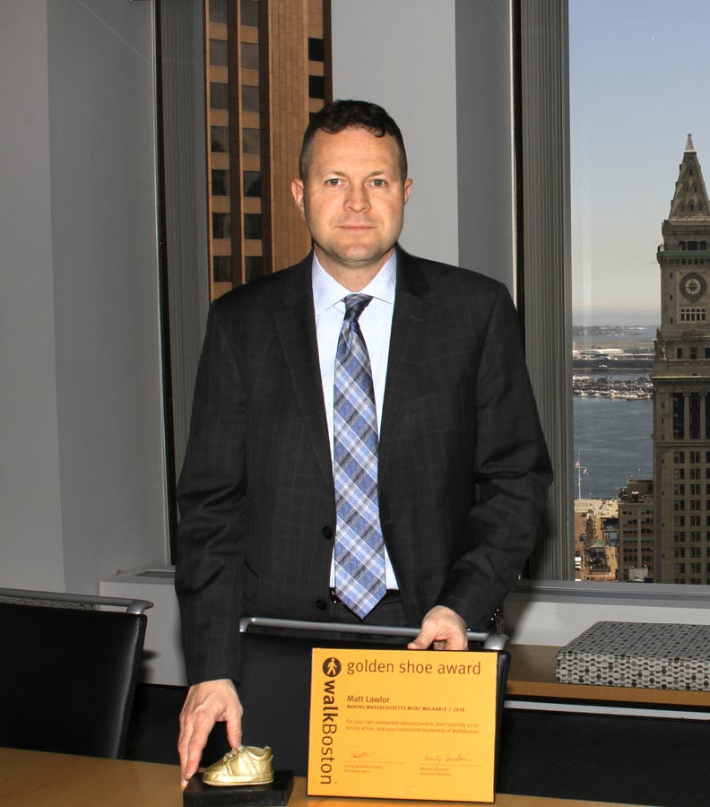 WalkBoston, an organization that strives to make walking safer and easier in Massachusetts in an effort to encourage better health, a cleaner environment, and more vibrant communities, presented Robinson+Cole lawyer Matthew J. Lawlor with its Golden Shoe Award during the organization’s annual celebration held at the Fort Point Room - Atlantic Wharf in Boston, Massachusetts on March 29, 2018. Mr. Lawlor is a member of Robinson+Cole’s Real Estate + Development Group.