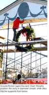 SALEM, MA - Just before joining the recent Wreaths Across America ceremony at Green Lawn Cemetery, Scouts from Boy Scouts of America Troop 24 scrambled up the scaffolding one more time to hang a holiday wreath from the Salem Common Arch.
