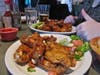 A simple but good presentation of wings, greens, and celery although it was noted that the amount of sauce per order was inconsistent, with some plates having noticeably more sauce than others.