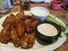 The wings came covered in a spicy/sweet red sauce (awesome color and aroma); sort of a mex-bbq style. Good sweet-tangy flavor and not overwhelmingly spicy. A nice blend of heat, tang, and flavor all on its own. Again, some orders had more sauce than others. Also available were the standard blue cheese dip or a jalapeño ranch dip. The blue cheese dip was average and the ranch seemed to be the favorite of the two, garnering comments of “excellent”, “very good”, and “yum”. One noted the blue cheese was a little sweet.
