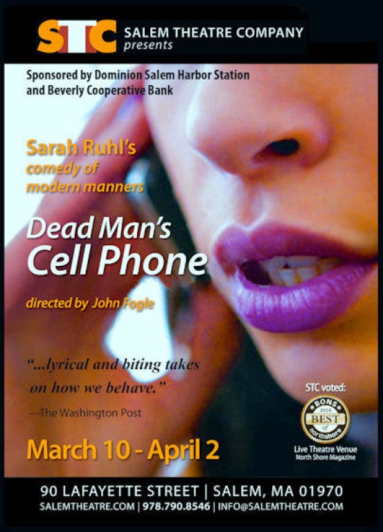Dead Man’s Cell Phone features Karin Anderson (Peabody), Grace Butler (Lexington), Dinah Cardin (Salem), Dave Rich (Marblehead), Katie Ventimiglia, (Topsfield), and Alan White (Malden). Emma Walker is the stage manager, with set design by Ruth Neeman, lighting design by Greg Mancusi-Ungaro assisted by James Wilkinson, costume design by Linda Ross Girard, and properties by Susan Fader.