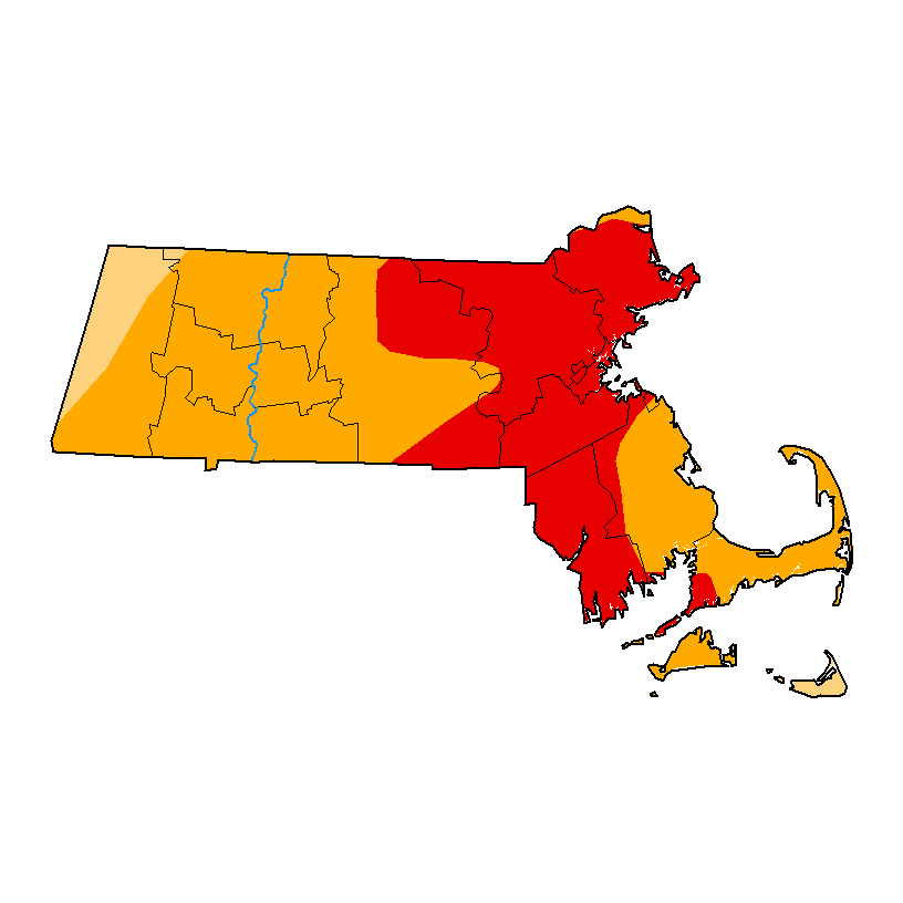 Here is the latest Massachusetts drought map courtesy of the U.S. Drought Monitor (areas in red are considered under "extreme drought" conditions):