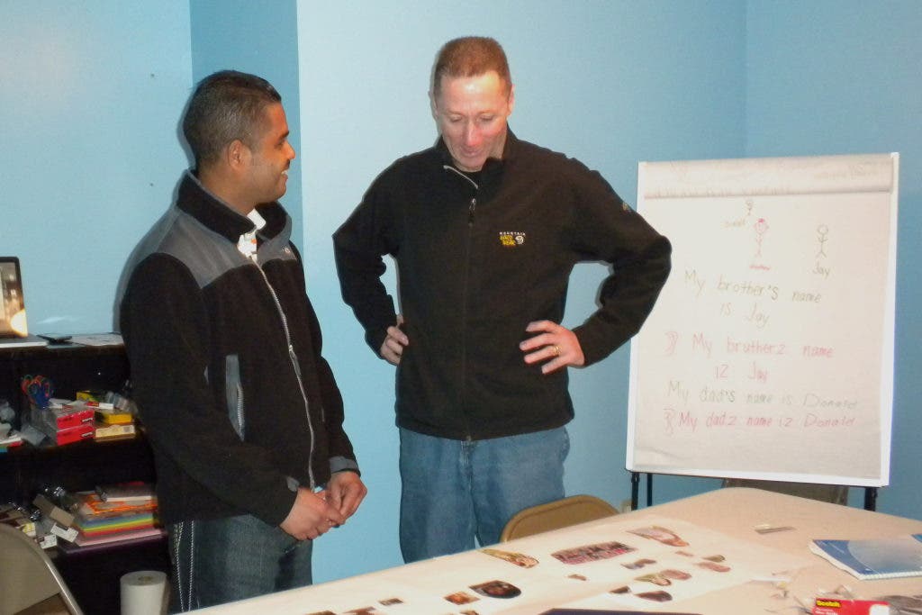 On May 10, Chief Paul Tucker came to our class. He arrived in civilian clothes, introduced himself using his title and first and last name and then became an active member of our class. My students were using family member vocabulary, while working on pronouns, possessive adjectives, and the pronunciation of the final /s/ sound in possessive suffixes. Students first had to make fake family trees using cutouts of people from magazines. After, they used their fake family trees to practice dialogue - "Who is she?" "She's my ____" "What's her name?" "Her name is____."