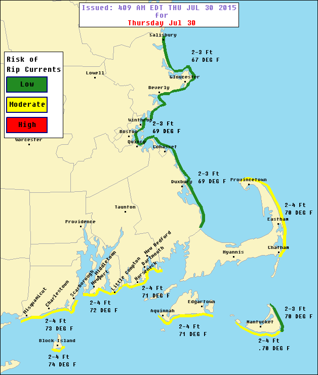 The National Weather Service is forecasting a low risk of rip currents today along South and North Shore coastlines. There is a moderate risk along outer facing Cape Cod and Southcoast beaches.