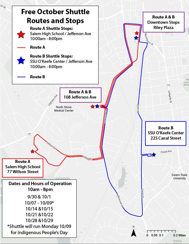 Shuttles will run from 10 a.m. to 8 p.m. with pickup locations at the Salem State O'Keefe Center parking lot at 225 Canal Street, Salem High School at 77 Willson Street and the Salem Hospital lot at 108 Jefferson Avenue.