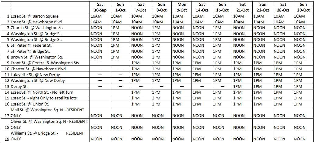 Other closures are set for Essex Street, Church Street, Washington Street, St. Peter's Street, Brown Street, Front Street, Charter Street, Lafayette Street, Derby Street, Mall Street, Oliver Street and Williams Street on a rolling basis beginning at 10 a.m. each weekend day and Indigenous Peoples' Day/Columbus Day on Oct. 9.