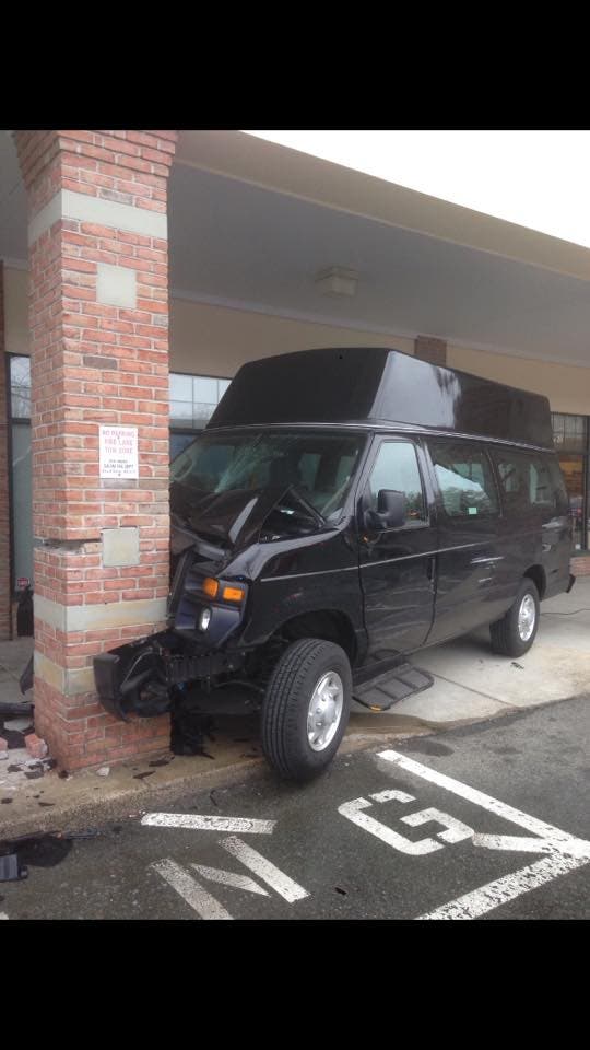 The building inspector inspected the damage to the pillar, and determined the structure was safe. The van sustained front-end damage, and was towed. There was a small dent in the building’s window frame.