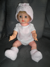 Hand Knitted Infant Hat and matching Bootees set, Size 0 - 6 months, soft pink yarn, hat has pink and white bow on band, bootees have white stripe on ankle ribbing. $14.00 for the set.Â