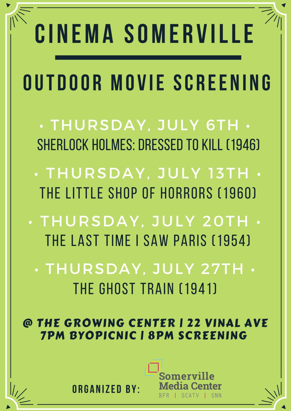 Cinema Somerville is a popup movie screening project of Somerville Media Center. It builds community in Somerville through collaborations with community organizations and residents by presenting free public film screenings at various locations in Somerville.