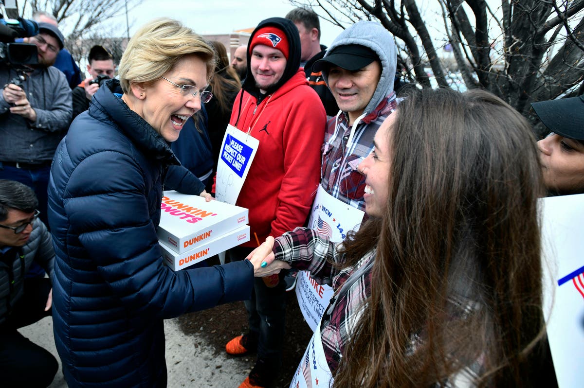 SOMERVILLE, MA ā Presidential contender Sen. Elizabeth Warren joined striking Stop & Shop workers in Somerville Friday. The Democrat was seen handing out pizza and doughnuts, posing for pictures and using a bullhorn to address the crowd on McGrath Highway.