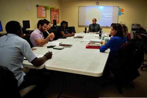 Janine Taylor, a professor at Bunker Hill participating in the partnership, brought her Learning Communities Seminar to JVS, and said she hopes to motivate students at JVS to go to college.