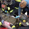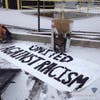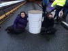 At 7:30 a.m., a white box truck unloaded nine protesters on I-93 North south of the city in Milton. Six of the protesters then chained their hands together inside 1,200-pound barrels filled with cement, while three stood nearby, Alben said. Two people in the box truck were arrested as well, for a total of 11 arrests at that location.