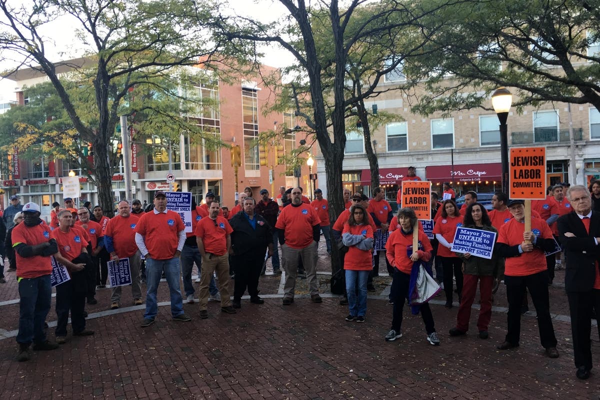 Somerville Municipal Employees Association (SMEA) members and other city public service workers held a rally for Dignity, Justice and Respect on October 17 in Somerville's Davis Sq.