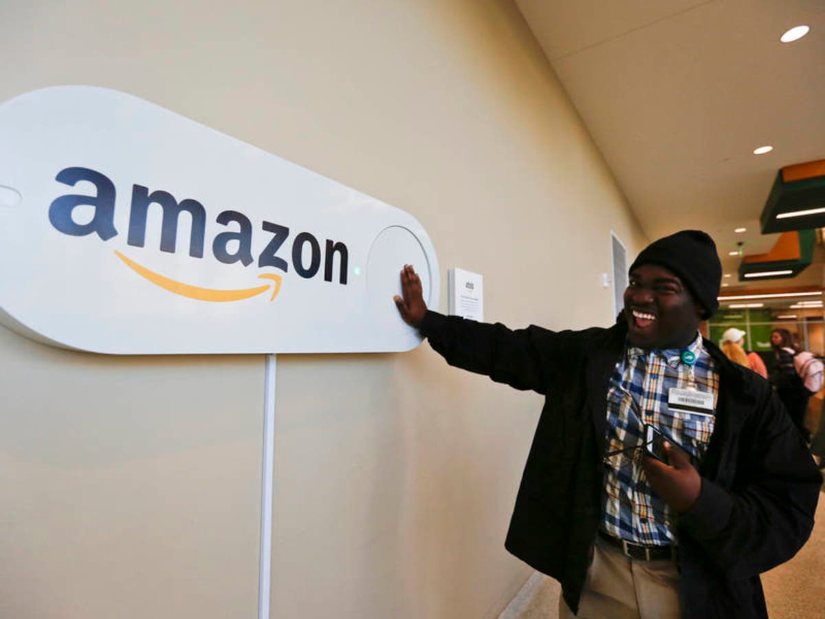 Zavian Tate, a student at the University of Alabama at Birmingham, pushes a large Amazon Dash button, in Birmingham, Ala. (AP Photo/Brynn Anderson)