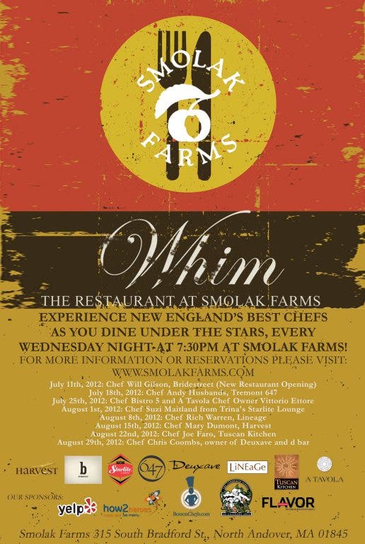 Boston’s favorite seasonal restaurant is returning for the summer! Back by popular demand, Smolak Farms presents “Whim” 2012. Located in North Andover, Massachusetts, Smolak Farms has partnered with Northeast Flavor, Cambridge Culinary School, Boston Chefs, Yelp and how2heroes.com to present the best outdoor dining experience New England has to offer.Whim will take place every Wednesday evening starting July 11th, 2012 and continuing until August 29th, 2012 at 7:30PM and will feature top chefs from all over New England. On July 18th, 2012, Andy Husbands of Tremont 647 will be featured and supports Share Our Strength charity. “Whim is such an innovative concept that is really difficult to ignore. It is something that people talk about and get excited for because it is a one-of-a-kind experience that you’re not going to find anywhere else. It is so easy to get wrapped up in the craziness of the city of Boston and I think people appreciate an evening away from it all. We’re taking the best food in the city and bringing it to a more rustic and relaxed setting. Top that off with the fact that each dinner supports a great cause and you really can’t beat it,” said Michael Smolak, owner of Smolak Farms.Guests will experience a meal under the stars prepared by some of New England’s most respected and praised chefs. Included in the $65.00 ticket price is a three-course dinner followed by a bonfire to meet and greet your fellow diners. Chefs will be accompanied by culinary students from The Cambridge School of Culinary Arts in order to help them smoothly and successfully execute dinner to an audience of over 100 guests each week. As implied by the event name, Whim, the menu is prepared the day-of at the discretion of the chef. “I had such an amazing experience last year at Whim, and I am both honored and excited to be participating again this summer. Knowing that I am able to do what I am passionate about while simultaneously helping a cause that is close to me is really what it is all about. It is such a unique night for both the chefs and diners, it’s not just a dinner, but an experience,” said returning chef Andy Husbands of Tremont 647 who will be cooking at Whim on July 18th, 2012.For more information on “Whim” – The Restaurant at Smolak Farms, please visit www.smolakfarms.com. Tickets can be purchased directly via: http://www.smolakfarms.com/whim